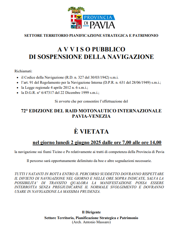 Si avvisa che l'Ispettorato di porto di AIPo ha disposto, con Ordinanza Prot. 14980 del 20/05/2025, la sospensione della navigazione a tutte le unità navali in transito sul fiume Po nel tratto della Regione Emilia-Romagna delle province di Piacenza, Parma, Reggio Emilia e Ferrara per la giornata di lunedì 2 giugno 2025 per lo svolgimento della gara motonautica 72° RAID MOTONAUTICO INTERNAZIONALE PAVIA VENEZIA.